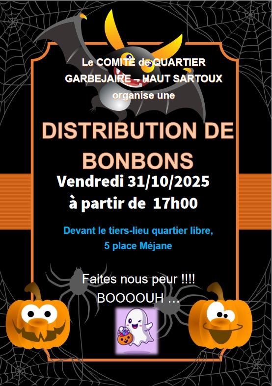 Distribution de bonbons Organisée par le comité de Quartier de Garbejaire Vendredi 31 Octobre à partir de 17 heures devant quartier libre Faites-nous peur!!!!!!!