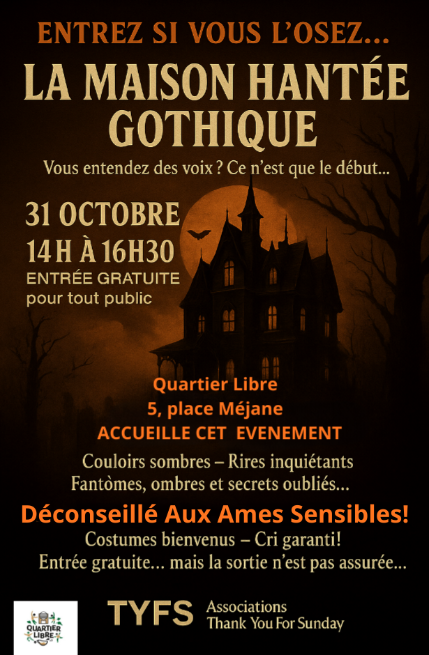 Avec l'association Thank You for Sunday Vous entendez des voix? ce n'est que le début... Couloir sombre, rires inquiétants, Fantômes, ombres et secrts oubliés Déconseillé aux âmes sensibles ! Costumes bienvenus, cris garantis Entrée gratuite... la sortie n'est pas assurée!